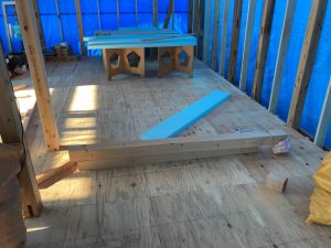 ↑根太と根太の間に断熱材を隙間なく敷込み、順次その上に構造用合板を貼り込んでいきます🔨