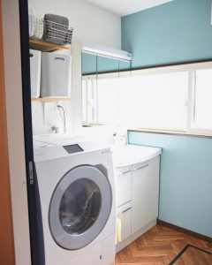 又、洗濯機の上や引戸上部のデットスペースに収納棚を設けることで、空間を有効活用し収納力を向上させました。