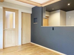 当社のリノベ住宅においてはマストとなっている、ニッチをデザインしたモニター・リモコンボックス。 スッキリとした見た目はもちろん、誤ってぶつかることなくジャマにならない優れものです。 又、ニッチ背面をアクセントクロスにしてみたり、エコカラット等の違う素材に変えてみたりと、オリジナルなコーディネイトが可能です。 当案件では室内壁面のグレーカラーで統一し、スタイリッシュでマテリアルなシンプルスタイルとなっています。