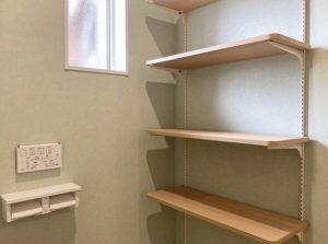また、そんな広い空間を活かして収納用の可動棚を設置し、ペーパー類や清掃用品の置場として利用をはじめ、観葉植物などのインテリアをディスプレイすることで、自分好みの癒しのあるトイレ空間をデザインできます。