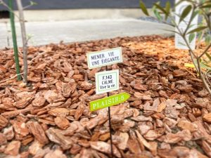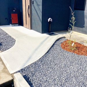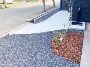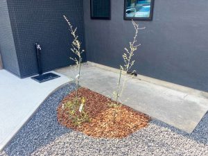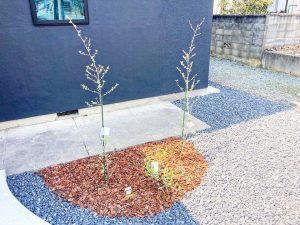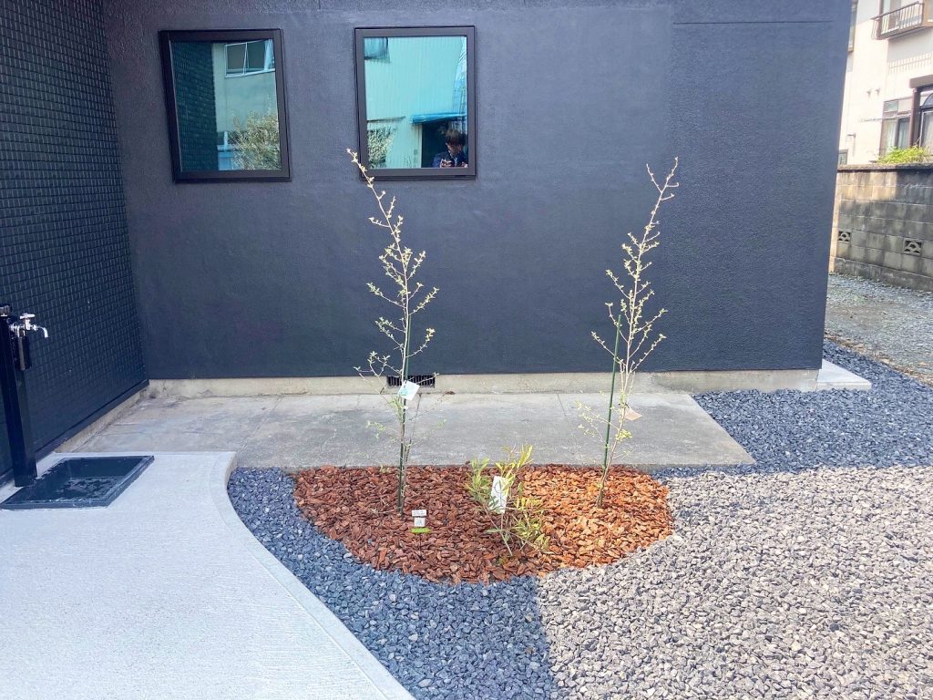 玄関エントランス脇にはシンボルツリーとしてロシアンオリーブを植樹し、新たに花や植物が植えられるガーデンスペースを設けたことで、ご家族でガーデニングを楽しみながら彩りある暮らしと住まいをデザインしました。